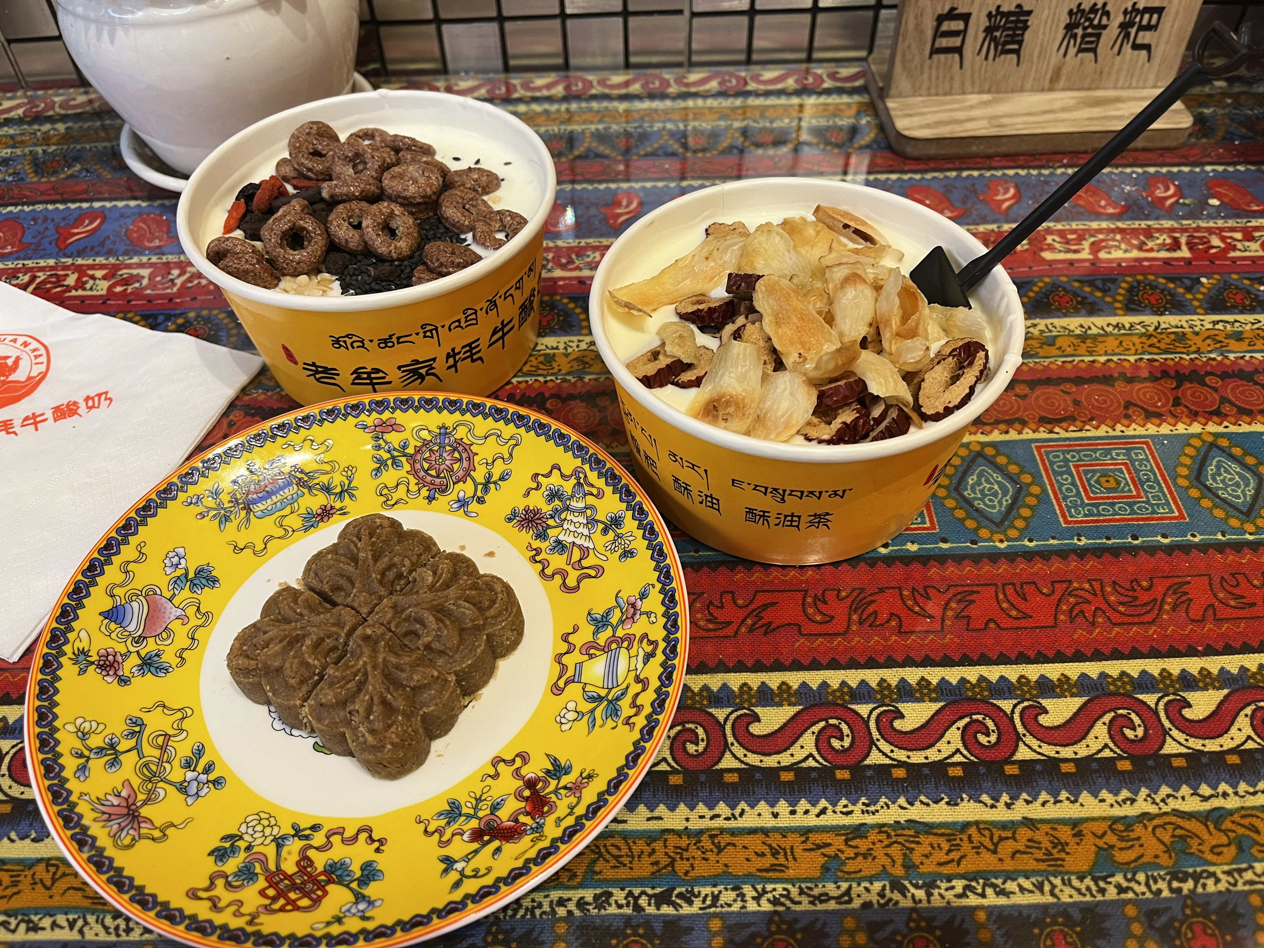 晚上吃了藏式酸奶配糌粑饼,味道还不错,就是有点小贵。