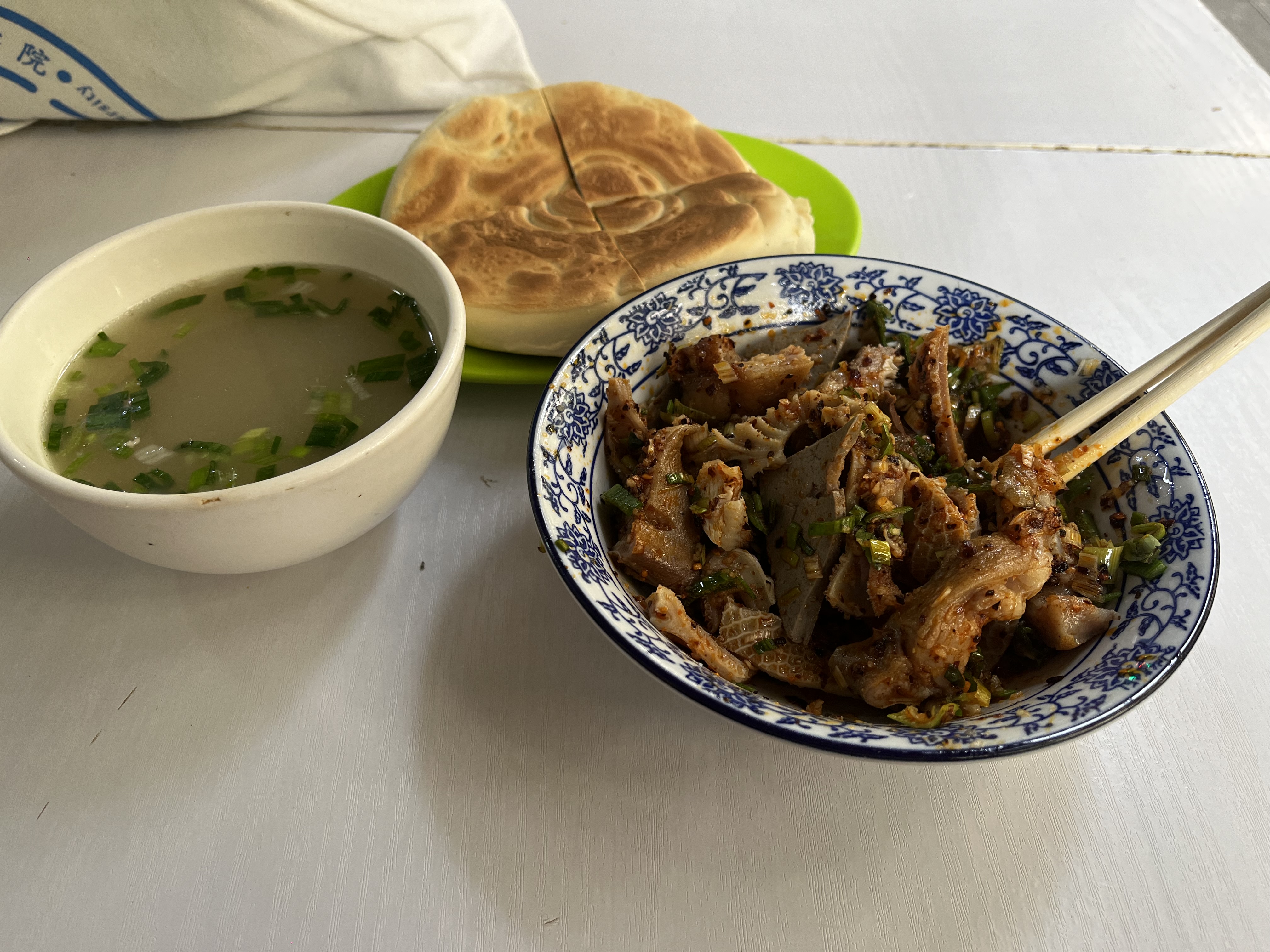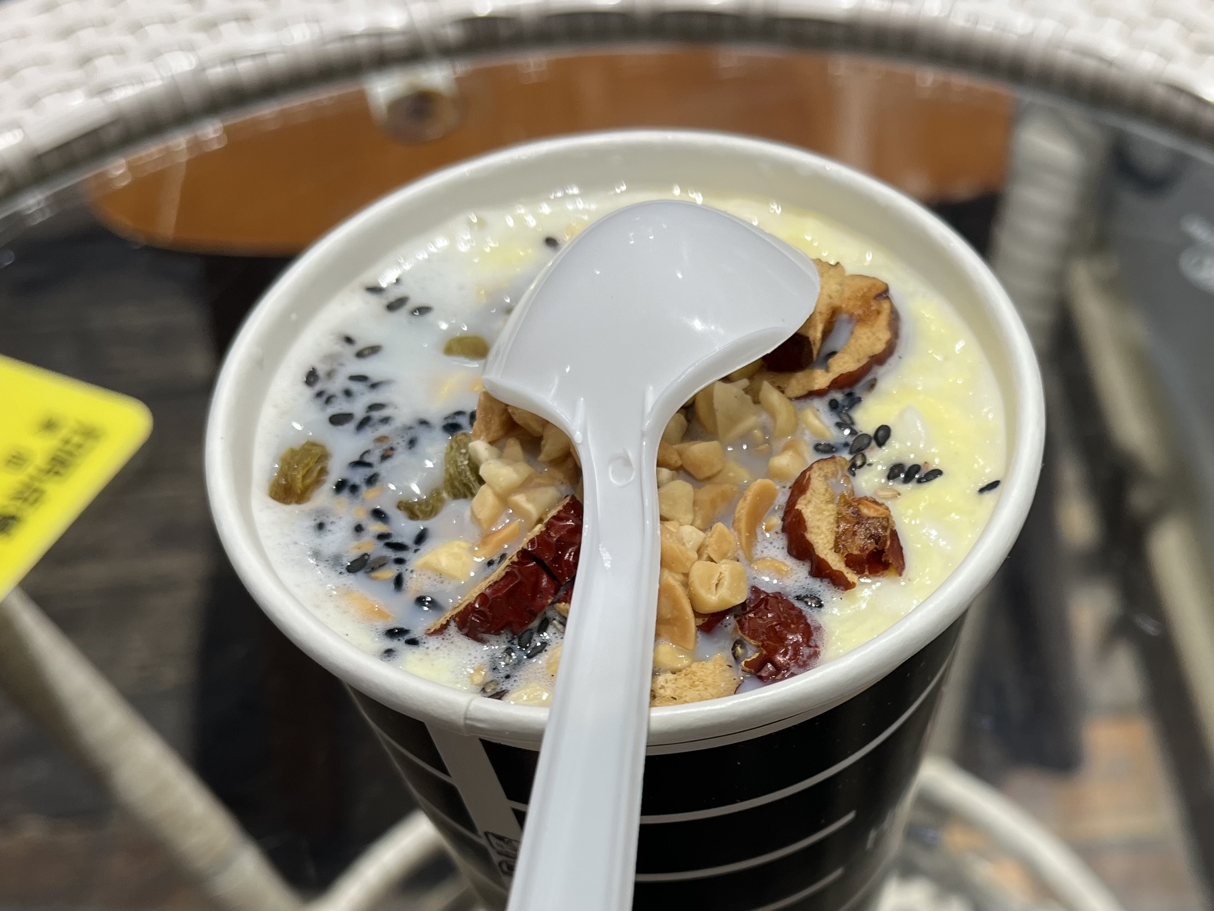 喝了当地特色的甜胚子奶茶,酸甜口,感觉吃着像葡萄干(?)然后喝了牛奶鸡蛋醪糟,感觉和在郑州的烤串店里喝的味道差不多。