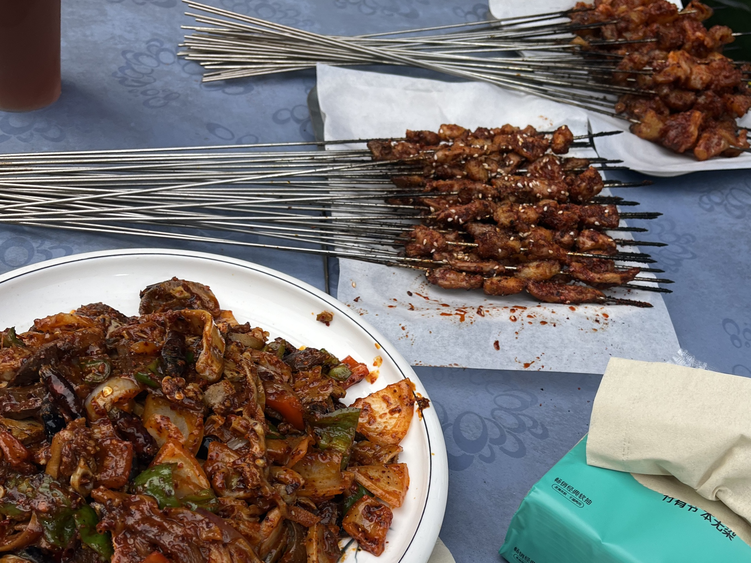夏令营结束之后,一个网友请我去南关夜市吃了烤羊肉串和炒羊杂,确实不愧是西北的羊肉,味道就是好。不过其实肉串的价格比郑州略高(别急,一会儿去西宁物价更高)。