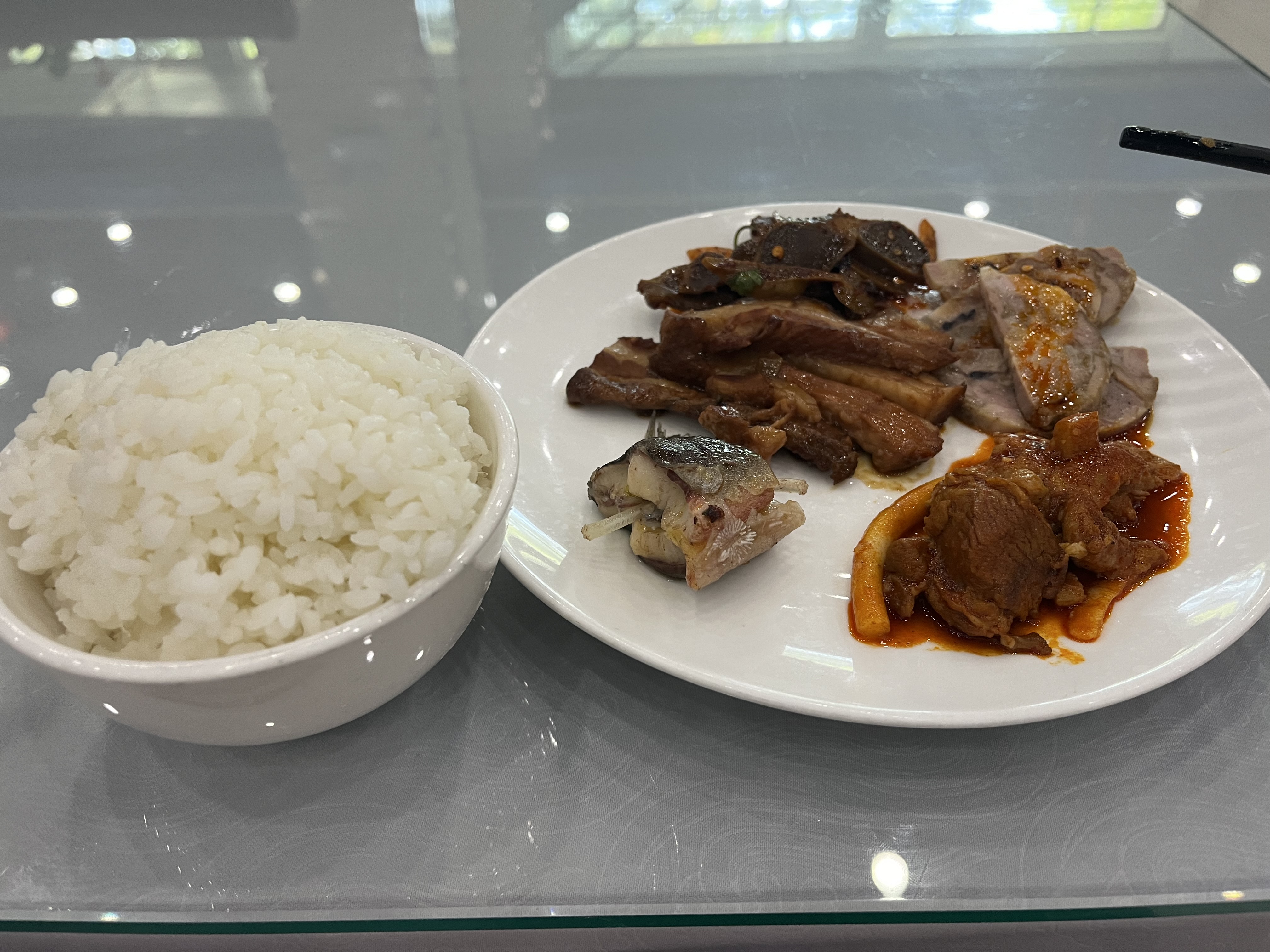 中午说是可以在食堂吃,但是不知道吃啥。到了食堂发现数学学院正在开个什么学术会议,把自选餐的部分拦起来给参会的老师吃了。我完全不知道这回事,问食堂阿姨,她看到了我胸前的夏令营的牌子,也没仔细检查就让我吃了。感谢数学学院的馈赠。